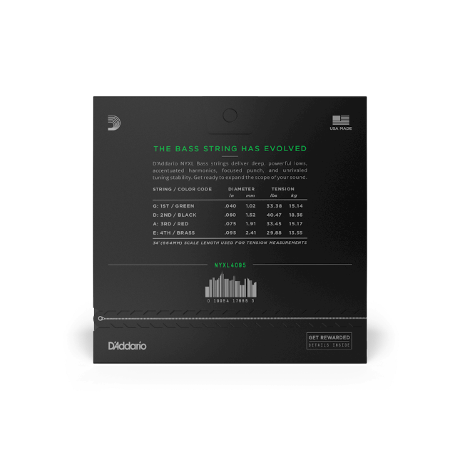 NYXL bass guitar strings are our premium uncoated bass string, delivering unrivaled strength and tuning stability, plus enhanced tonal response. The premium nickel-plated steel wrap wire used for NYXL bass strings features a reengineered core-to-wrap ratio, for a more versatile string which still maintains a familiar feel, plus accentuated harmonics. Thanks to the NY Steel core wire, NYXL bass guitar strings stay in tune better and offer greater break strength than standard bass strings. NYXL bass sets have a code on the recyclable, resealable VCI bag, which you can register to earn Players Circle points. NYXL bass guitar strings are made in the USA—drawn to our exacting specifications at our New York production facility.
