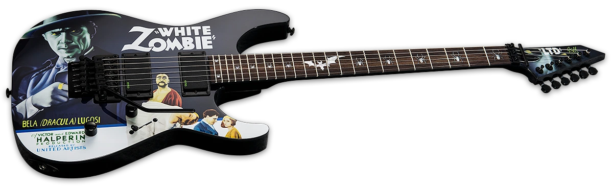Kirk’s latest signature model is the LTD KH-WZ White Zombie, a reproduction of Kirk’s own guitar featuring artwork from the classic Bela Lugosi horror film of the same name. It features an alder body, maple neck, macassar ebony fingerboard with bat and spider inlays, a Floyd Rose bridge, and EMG active pickups. Each guitar includes a custom graphic form fitted case from the Tombstone Case Company.