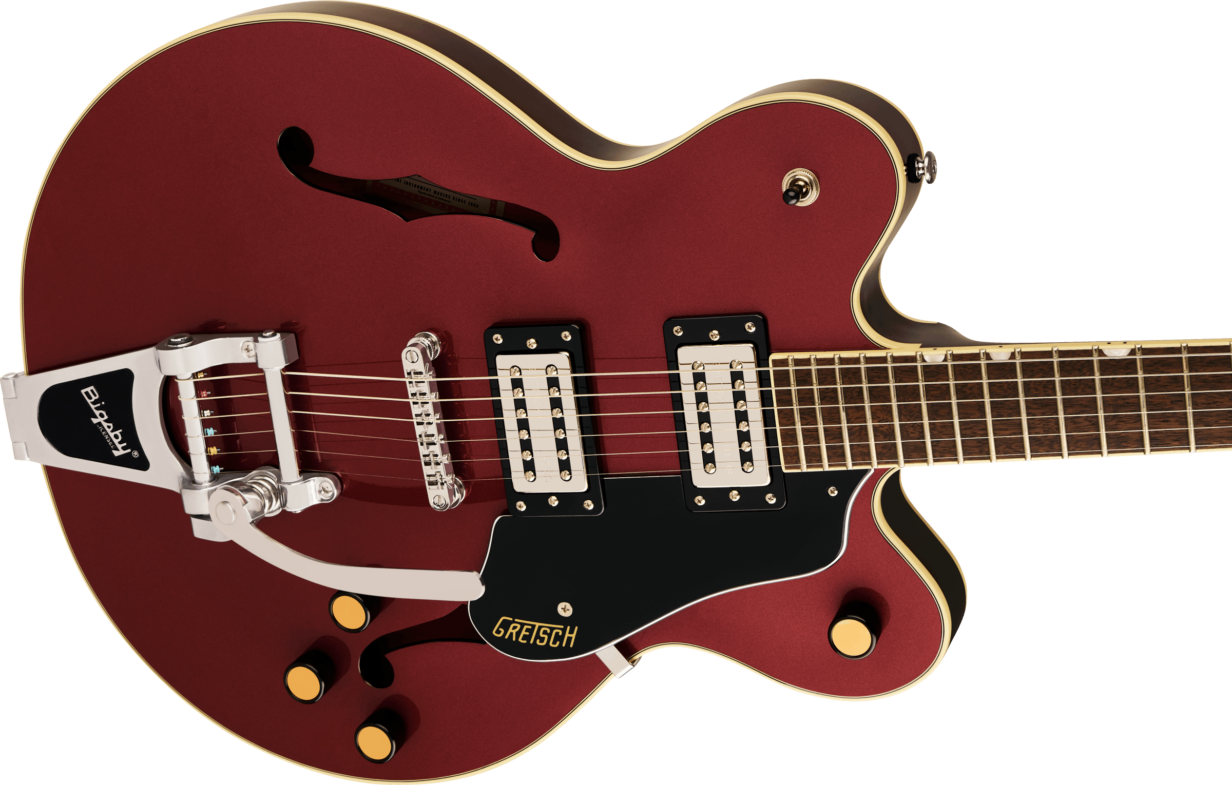 The secret to the Streamliner’s sound is twofold—the Broad’Tron™ BT-2S humbucking pickup and the spruce center block. Designed specifically for the Streamliner Collection, the high-output Broad’Tron BT-2S pickup spawns improved definition with tighter bass response for robust lows, pristine highs and a throaty midrange. A lightweight spruce center block runs the length of the body, reinforcing the top while eliminating undesired feedback for volume-friendly performance on rocking stages. The Streamliner’s sonic power is harnessed and shaped by the traditional control layout—neck and bridge pickup volume controls, a master tone control, master volume control and three-way pickup switching. A fast-playing 12”-radius laurel fingerboard with elegant pearloid Big Block inlays and 22 medium jumbo frets sits atop the white-bound nato neck with a thin “U”-shaped profile—ideal for chord work or fiery riffing. Add some shimmer and expression to your playing with the Bigsby-licensed B70 vibrato tailpiece, while the anchored Adjusto-Matic™ bridge and synthetic bone nut grant astounding tuning stability and accurate, slip-free intonation.