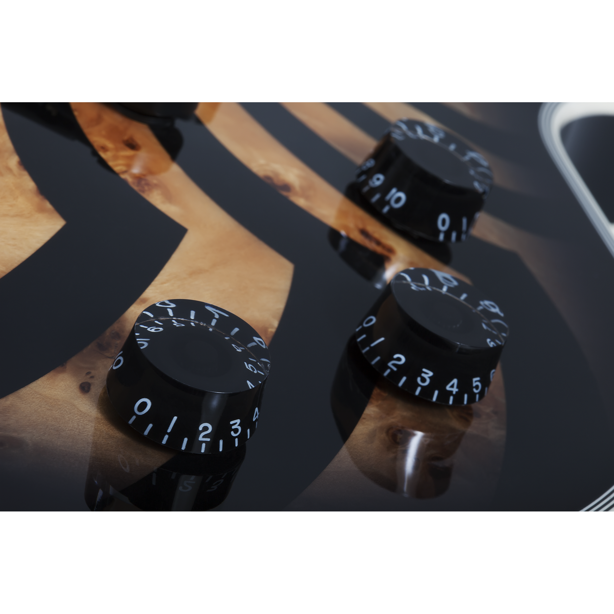 An ebony fretboard is characterized by a clear and precise tone quality. The dense structure of the wood allows the string vibrations to be efficiently transferred to the body, resulting in a balanced sound spectrum with clear highs and well-defined mids.